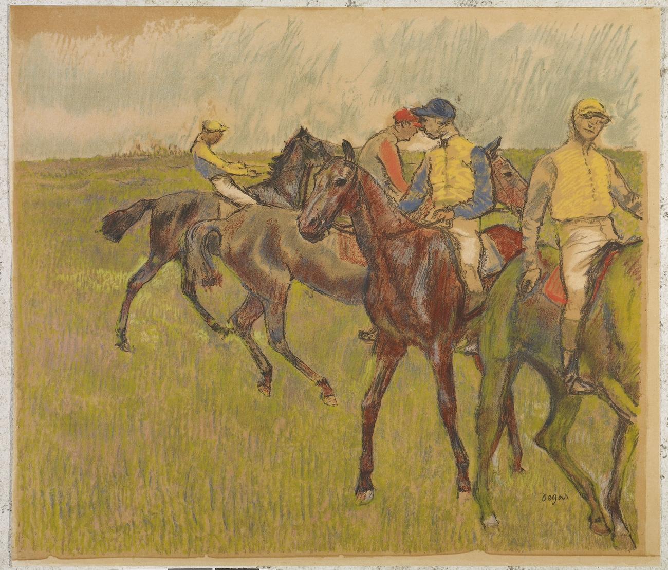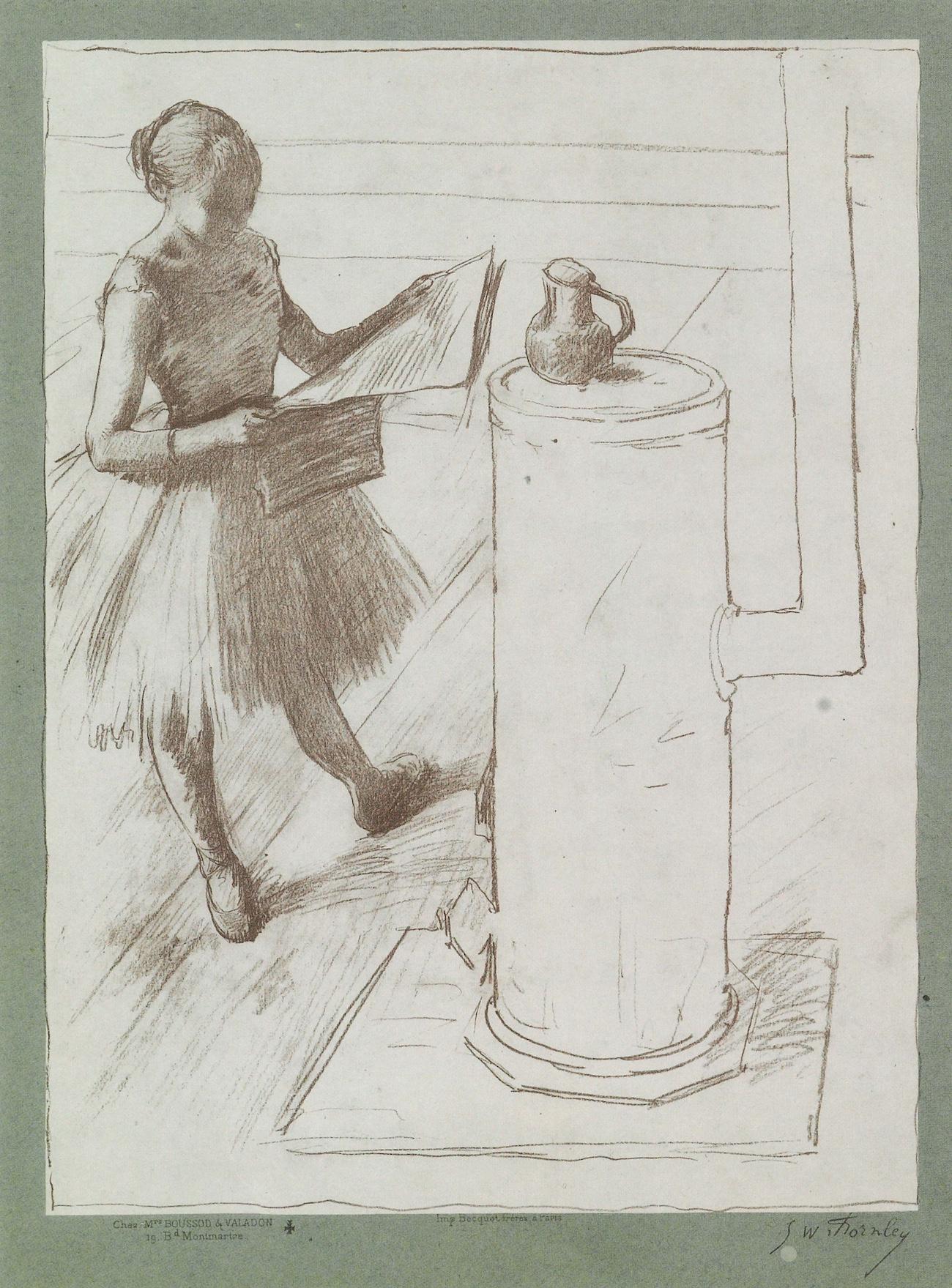 The works by Degas in this exhibition consist of 24 drawings, 21 prints, eight photographs, three monotypes, one sculpture, one printing plate, and a letter, all from a single private collection. The collection endeavors to illuminate the background and personality of Edgar Degas the man, as well as to present his genius as an artist. The subject matter of these works by Degas is often quite personal. In addition to three rare self-portraits, the collection includes depictions of his father, his brother Achille, an Italian niece, his loyal housekeeper Sabine Neyt, and the wife of a patron, Madame Ernest May; three portraits of Edouard Manet and two of Mary Cassatt; and drawings after antique sculpture and Old Masters such as Mantegna and Michelangelo. Works touch upon three notable themes of Degas' oeuvre: the human body, horse racing, and ballet. Also included is a group of brilliant color photogravures after Degas monotypes by Maurice Potin, which were commissioned shortly after the artist's death by the owner of the original monotypes, Degas' friend and dealer, Ambroise Vollard.