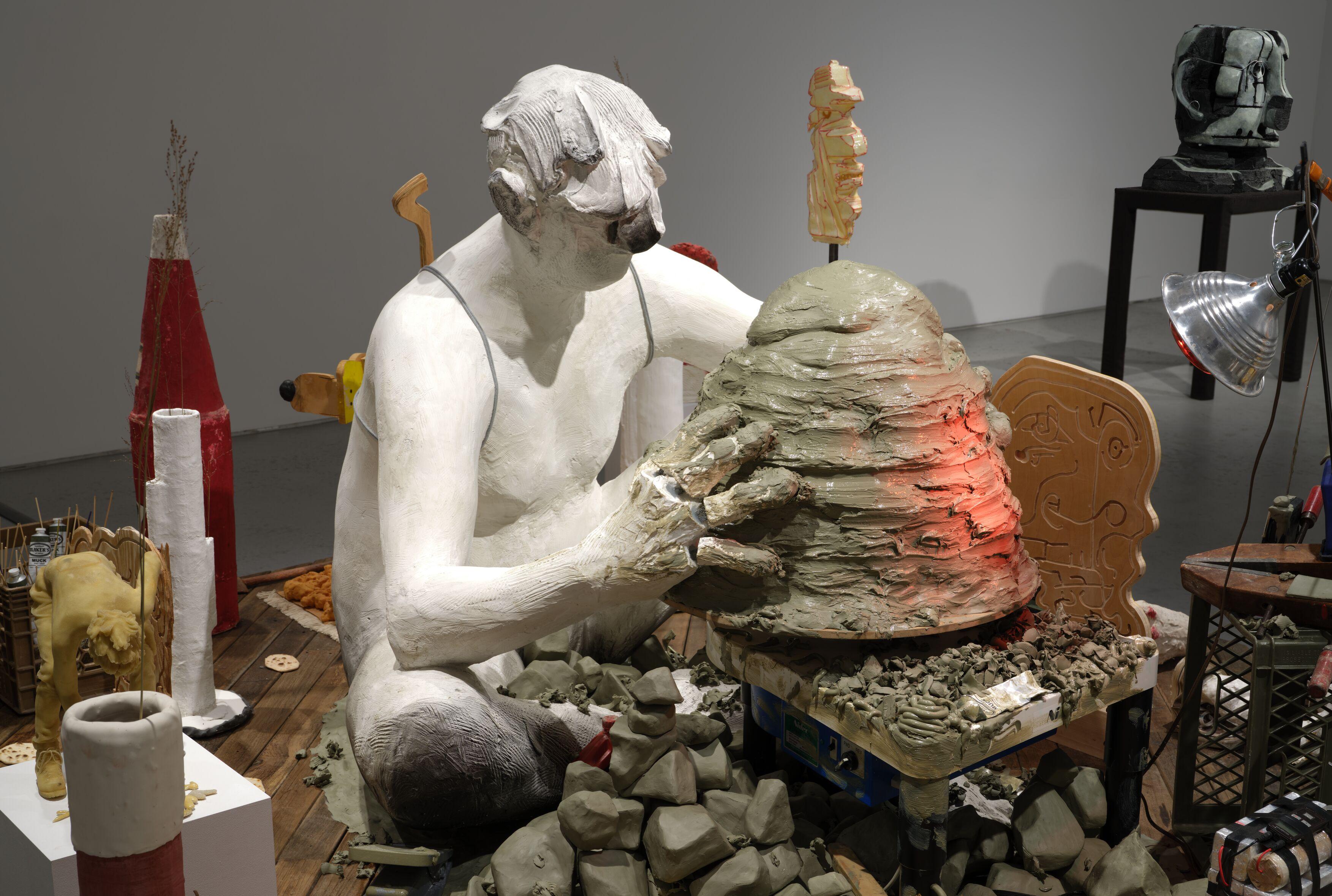 Speaking of which, Eisenman’s showstopping installation, Maker’s Muck, transforms the adage about omelets and eggs into a purgatory of the ever-present now. Set on a wooden stage measuring 130 square feet, the piece revolves around a potter hunched over a hive-shaped hunk of clay on a turning, motorized wheel. His hands are fitted with articulated fingers that endlessly rumble along grooves in the material, which is as crude and lumpy as the rendering of the character himself. Surrounded by a debris-scattered field of trial and error (unfinished sculptures, chunks of discarded clay, and other bits of trash), the potter will never leave his wheel or finish his project or exit the mess he’s created. In this tableau, as in their entire show, Eisenman offers a piquant metaphor for that inchoate experiment called life.